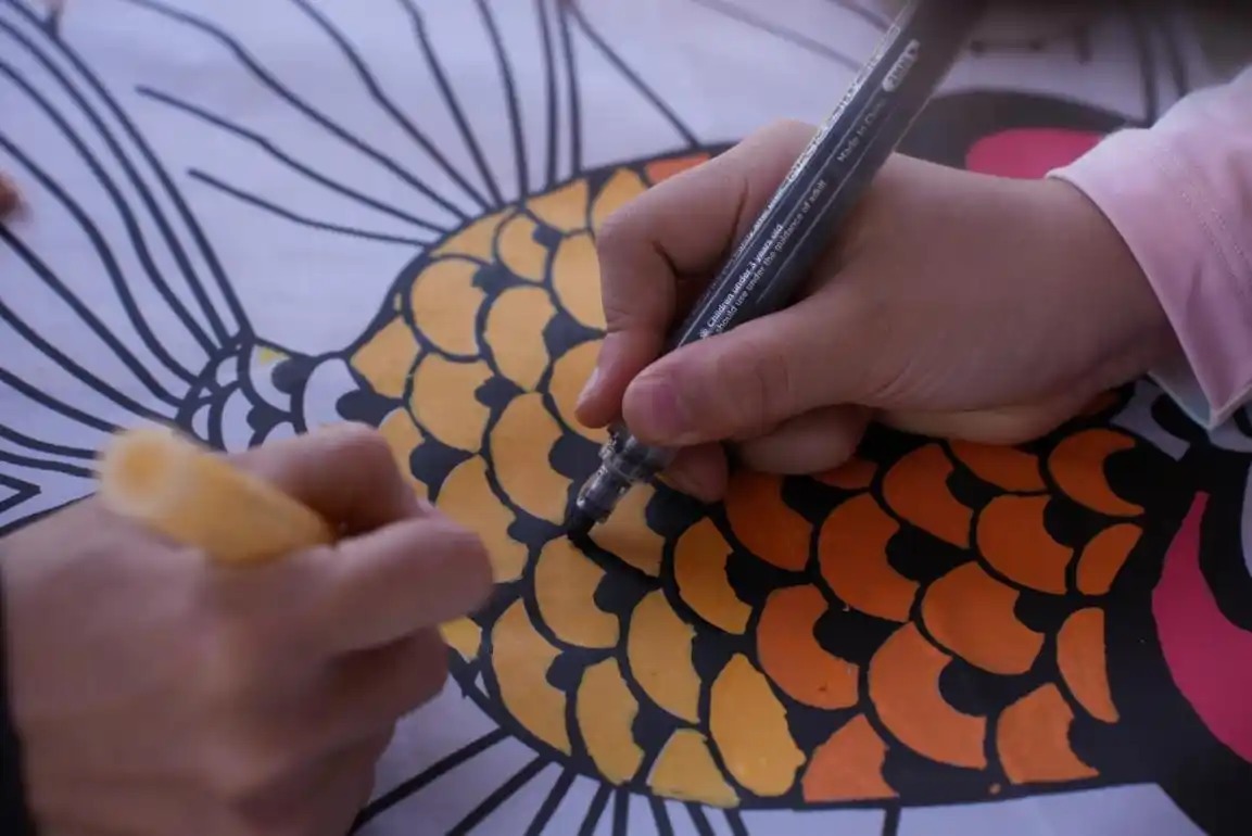 领略春日、体验编柳枝后,最受孩子们期待的手绘风筝活动环节正式拉开帷幕。研学老师提前准备好空白风筝、颜料、画笔等材料,先向孩子们讲解二十四节气与清明放鸢习俗的关联,引导孩子们将自然观察所得、柳枝编织的乐趣与仰韶文化元素、节气符号相结合,让孩子们大胆发挥想象,制作出独一无二属于自己的风筝。
