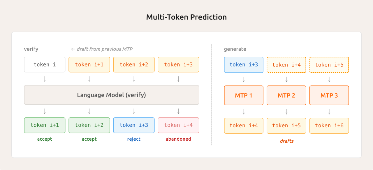 另一个黑科技是轻量级多 Token 预测 (MTP)。