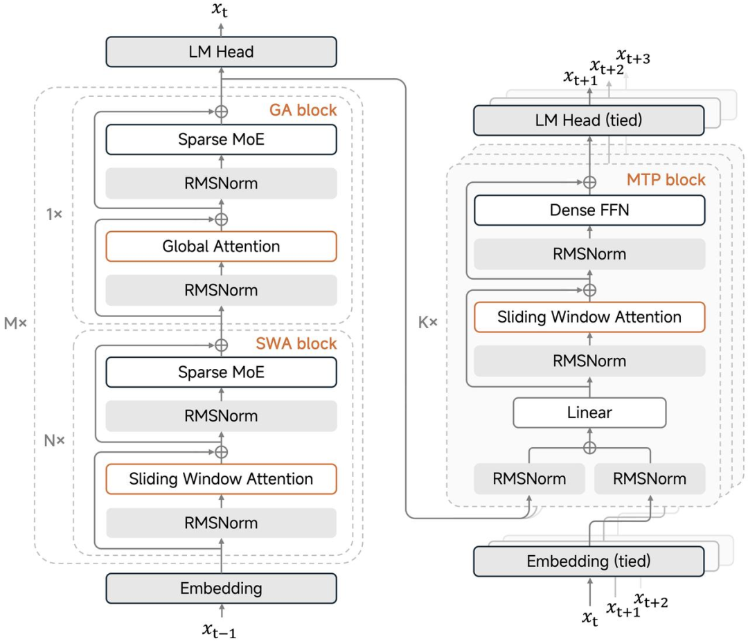 小米这次采用了 5 比 1 的激进比例,5 层滑动窗口注意力搭配 1 层全局注意力交替使用,滑动窗口只看 128 个 token。