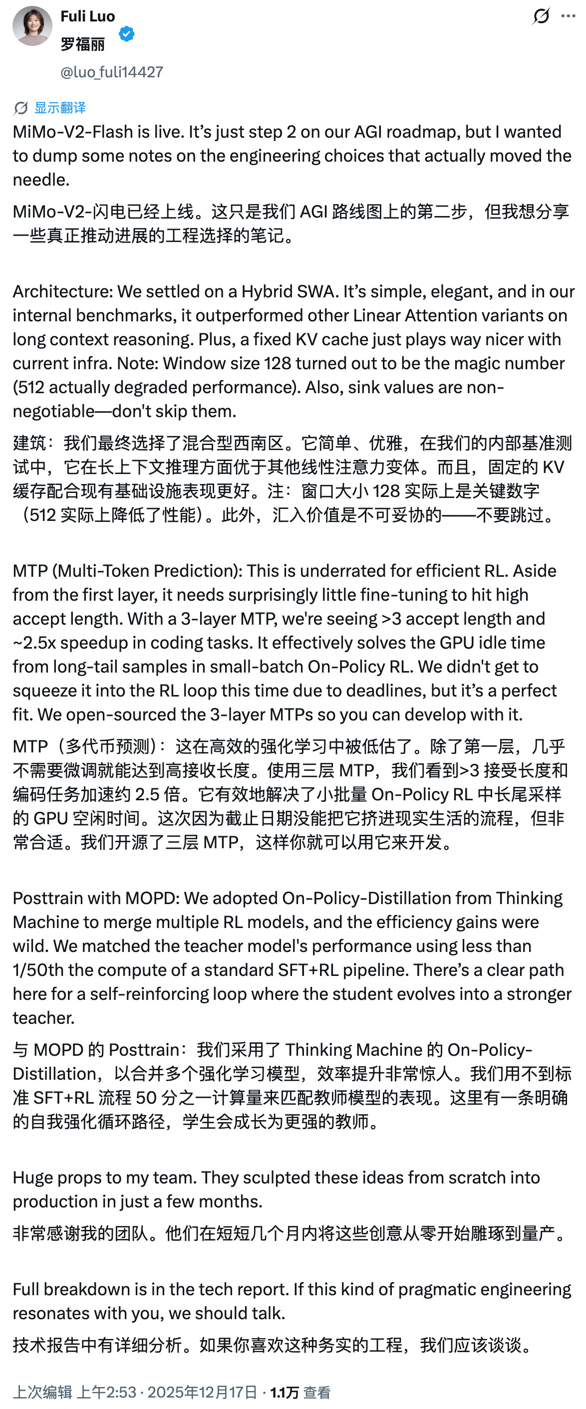 不过罗福莉也坦诚,这次因为时间紧迫没能把 MTP 完整集成进 RL 训练循环,但它与该流程高度契合。小米已经把三层 MTP 开源了,方便大家在自己的项目中使用与开发。