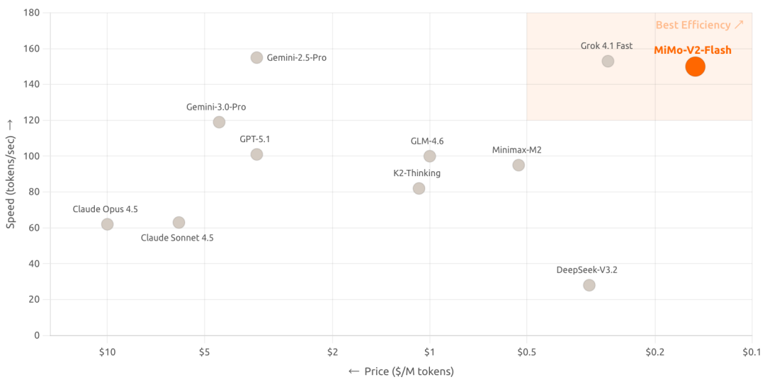 此外,MiMo-V2-Flash 采用 MIT 开源协议,基础版权重也已经在 Hugging Face 上发布。除去「开源」这一标签,新模型真正的杀手锏在于架构设计上的激进创新,把推理速度拉到了 150 tokens/秒,成本压到了每百万 token 输入 0.1 美元、输出 0.3 美元,主打一个超绝性价比。
