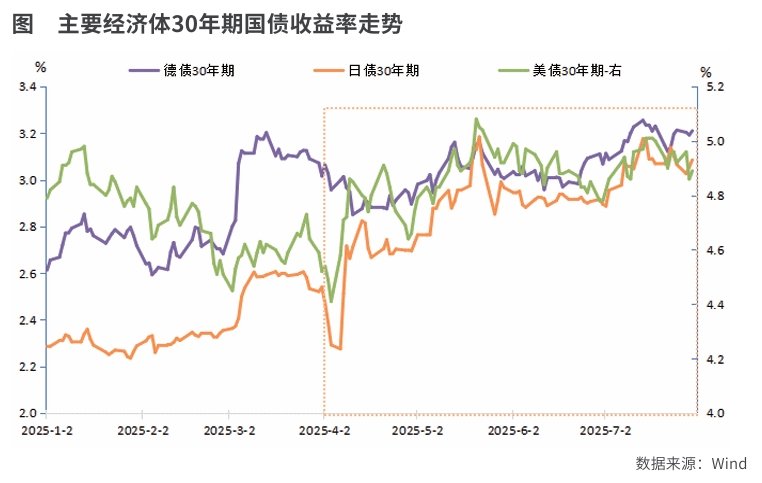 2025年以来,美国、德国和日本的超长期国债收益率呈现显著上行态势。截至7月30日,三国30年期国债收益率较年初分别上行10-80基点,不仅明显大于同期10年期国债收益率的上行幅度,更与2年期国债收益率的下行趋势(日本除外)形成鲜明反差。